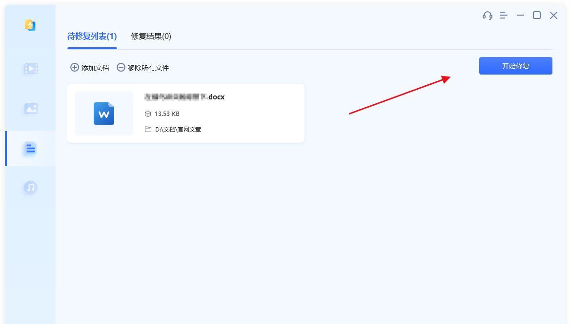 第2步:上传好需要修复的文档后,在“待修复列表”可以查看已上传的所有文件,然后点击“开始修复”,软件开始修复文件。