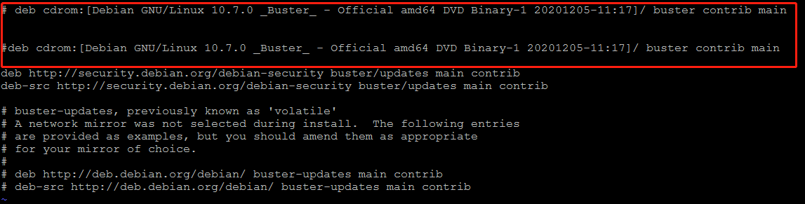 Debian10.7的安装参考我之前发布的Debian 10.8 的安装步骤,安装过程中为了模拟真实的测试环境,物理机的网络断开了,不然在安装过程中系统会自动下载最新升级包,升级到10.8版本。