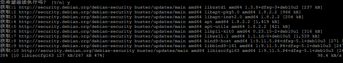 输入y后系统开始下载操作,进度是安装源的网络情况。